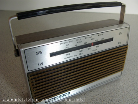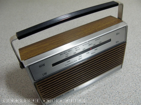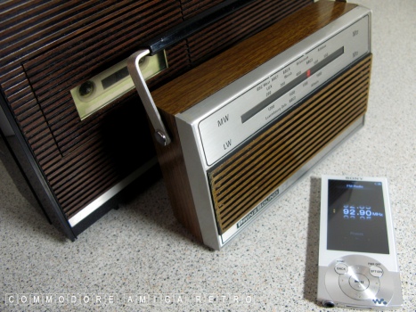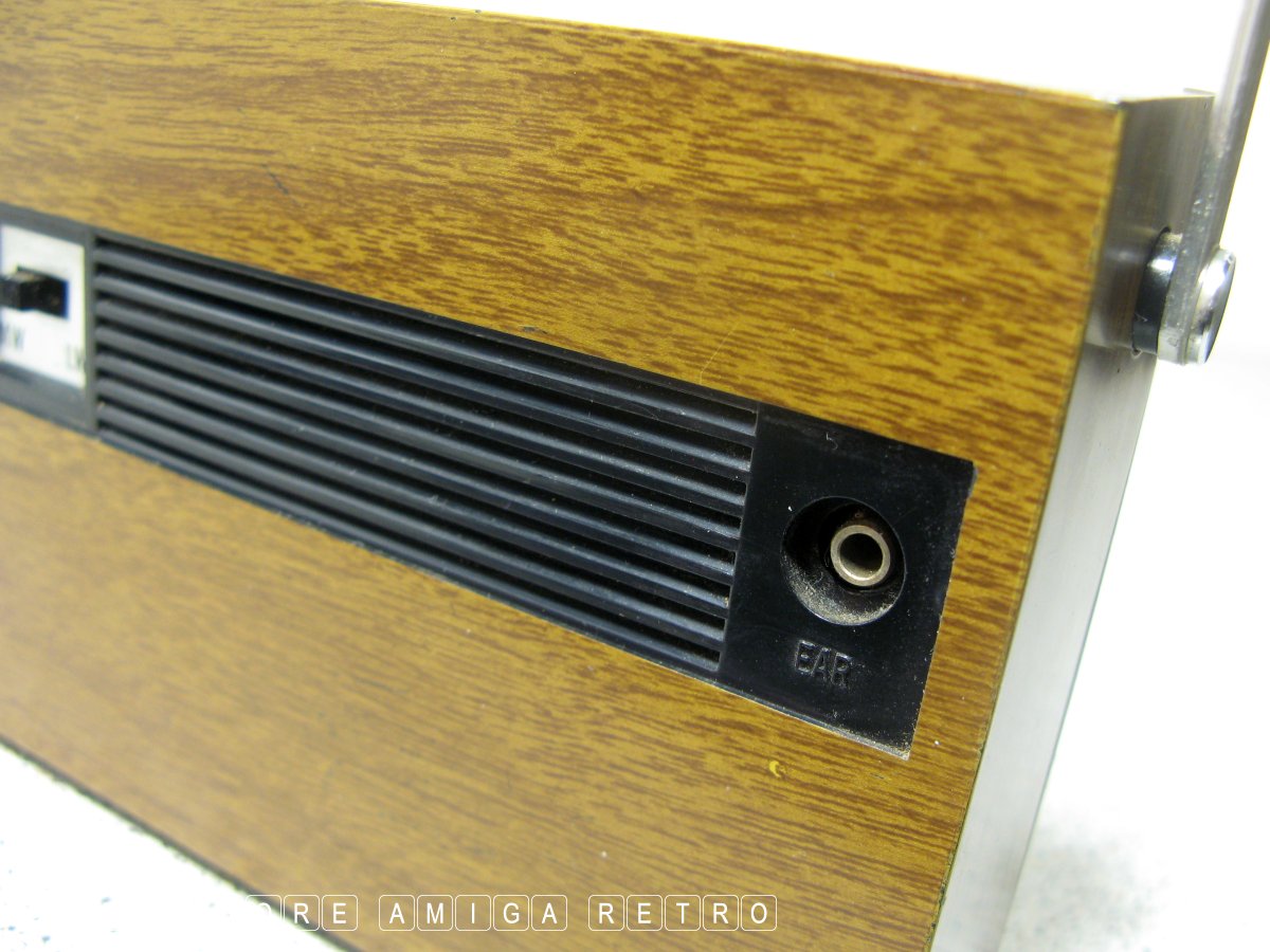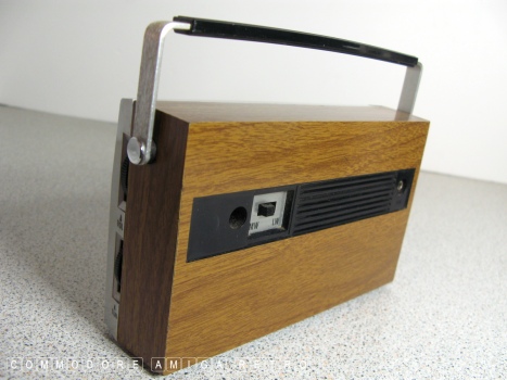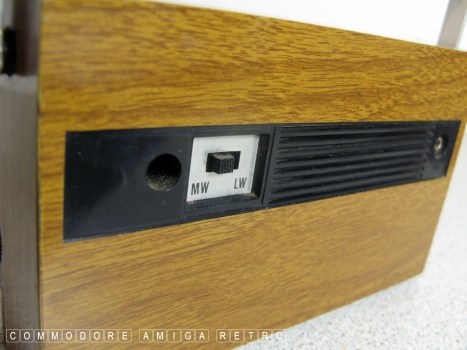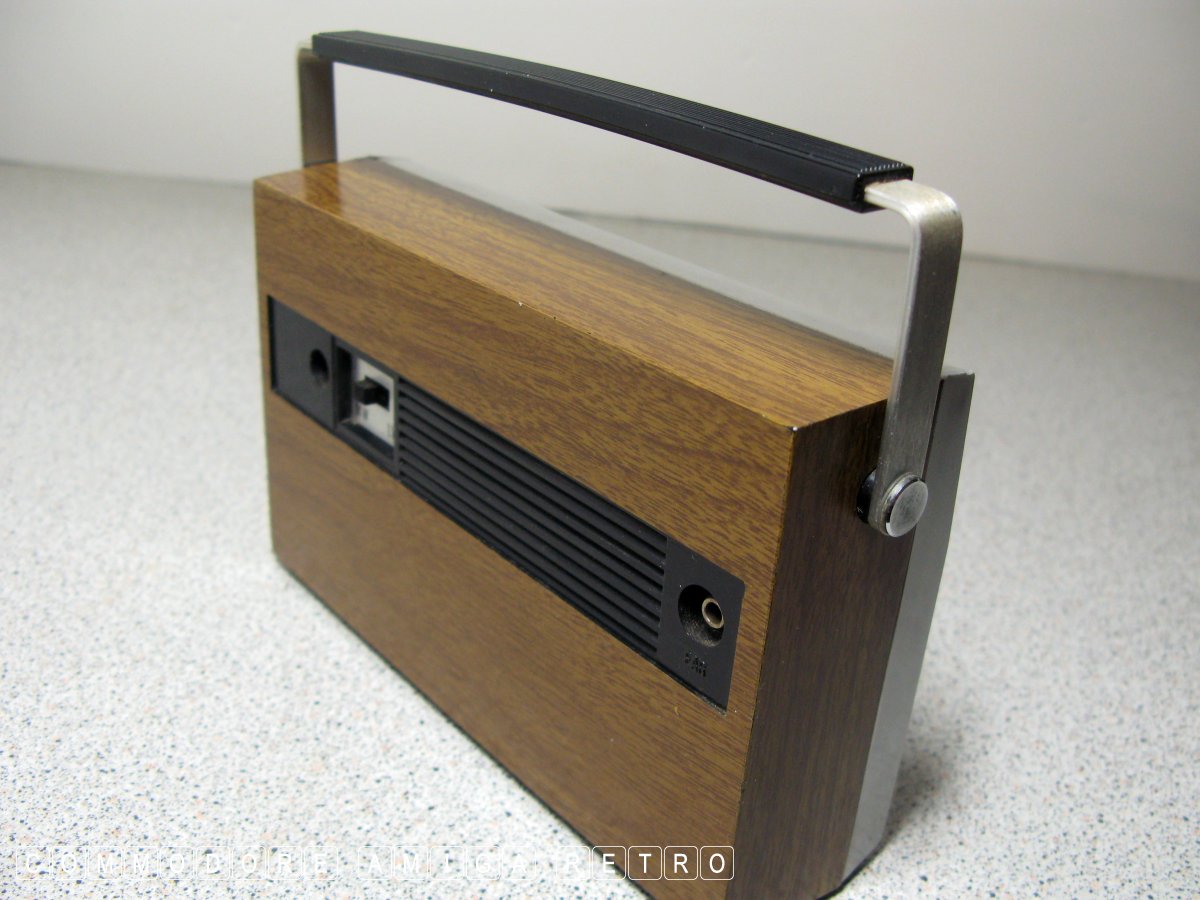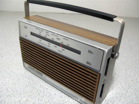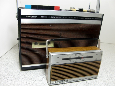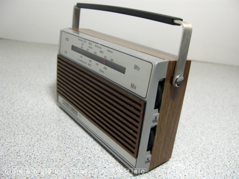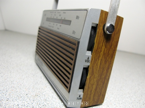 radio. The unit features the usual fake wood and battery power