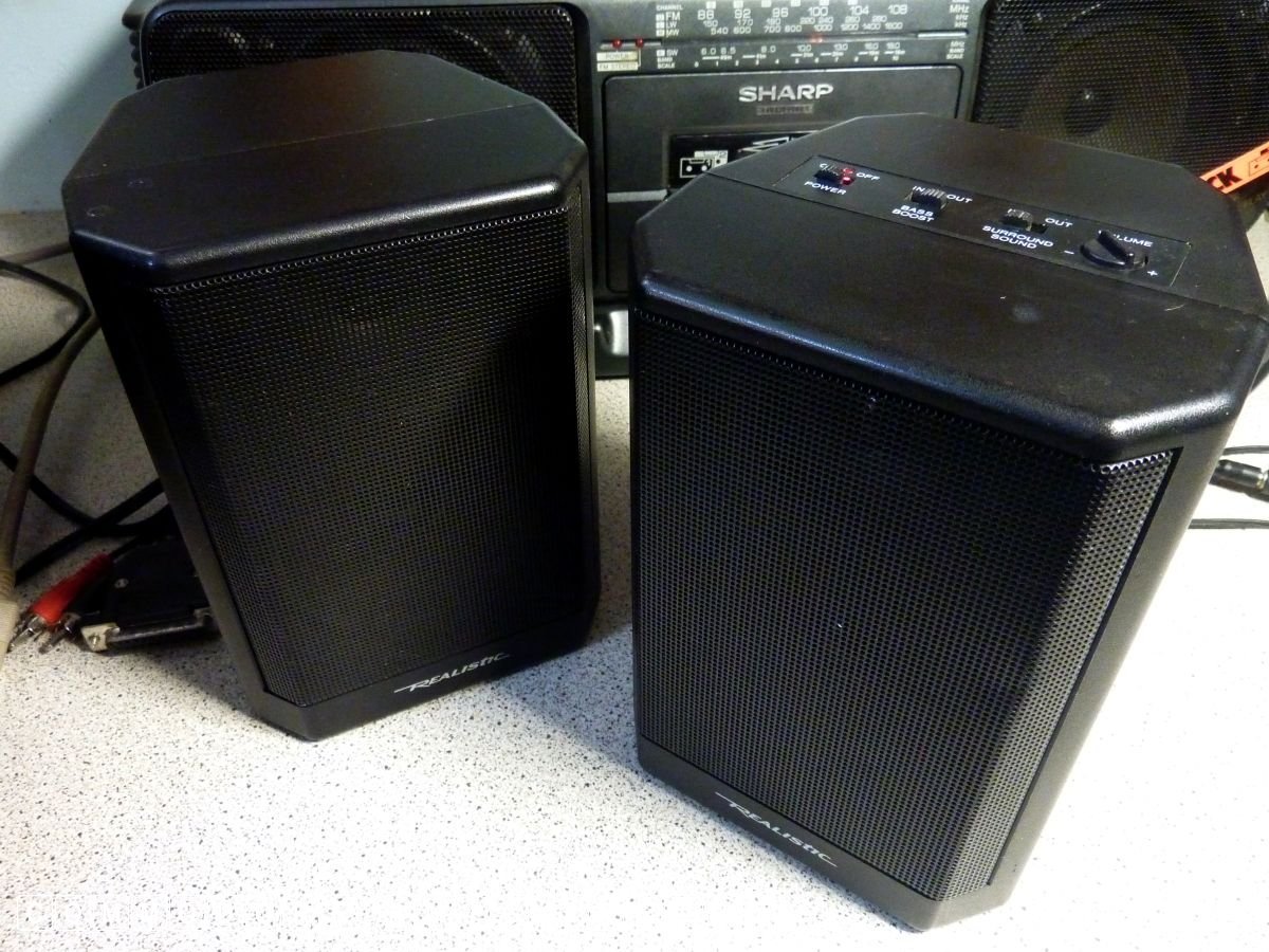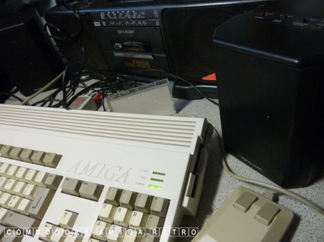 heavy pair of Radio Shack speakers all playing through the Amiga.